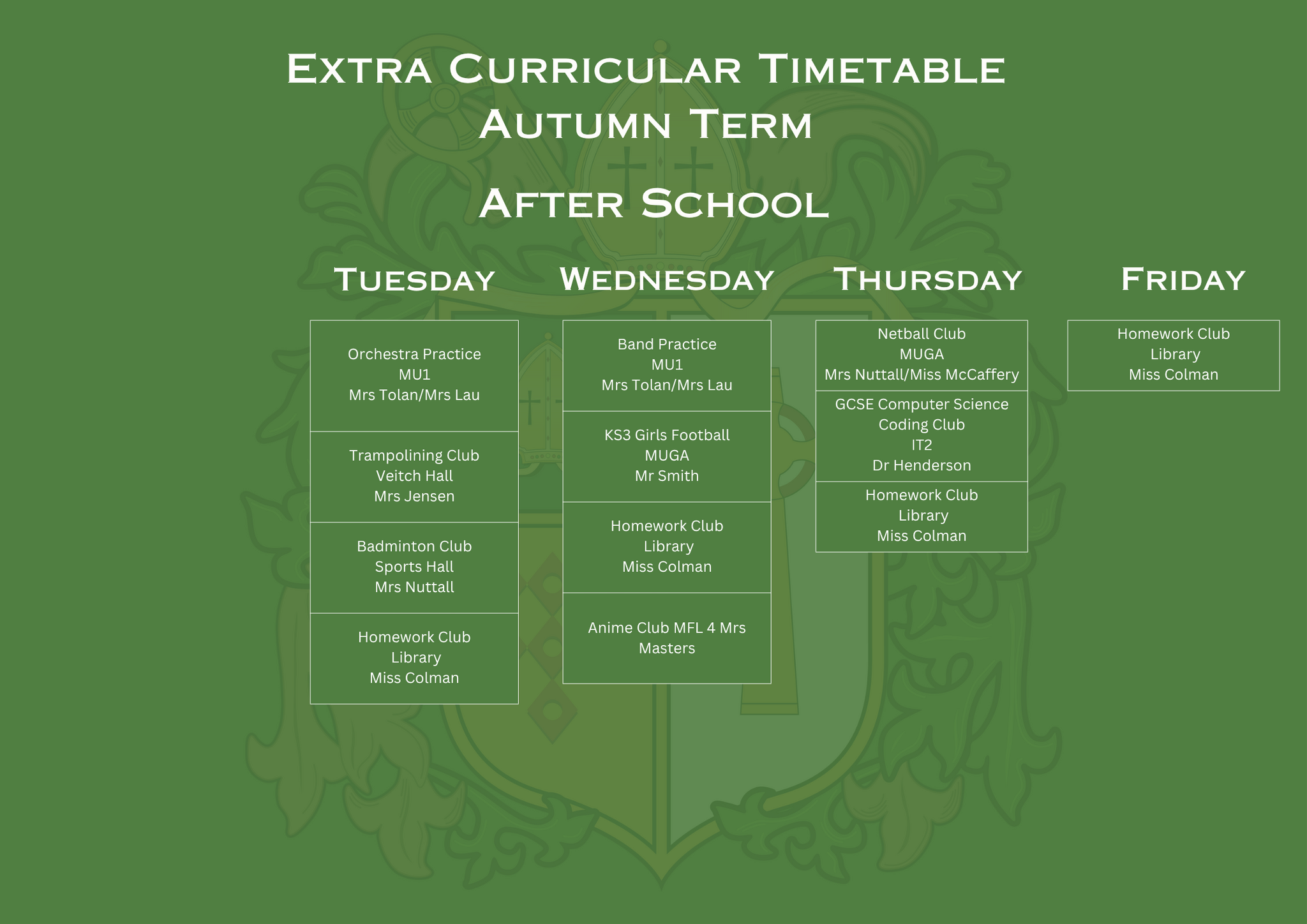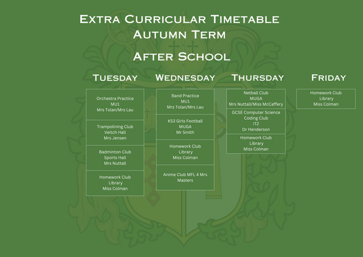 Homework Club – open to all year groups, in our school library, Tuesday to Friday until 4pm.