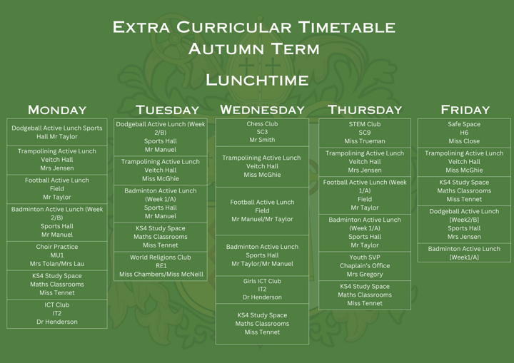We update our timetable termly to reflect the clubs on offer to pupils. Please see below for our current term's timetable: